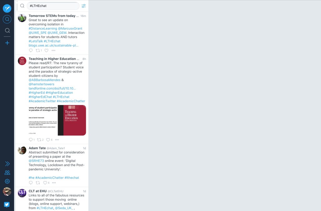This is the second time I’ve been involved in the #LTHEchat organising team, the first time, I had to learn fast about the tools in Twitter that make chats, curation of tweets and archiving happen. The second time around, albeit amidst a pandemic, I have enjoyed working through the same procedural tasks but with refreshed eyes and different perspectives from what were my new team mates, Caroline and Kate. (Working from home during a pandemic, with two children and my husband also trying to get their heads down for some time each day, is a blog for another time and page!)