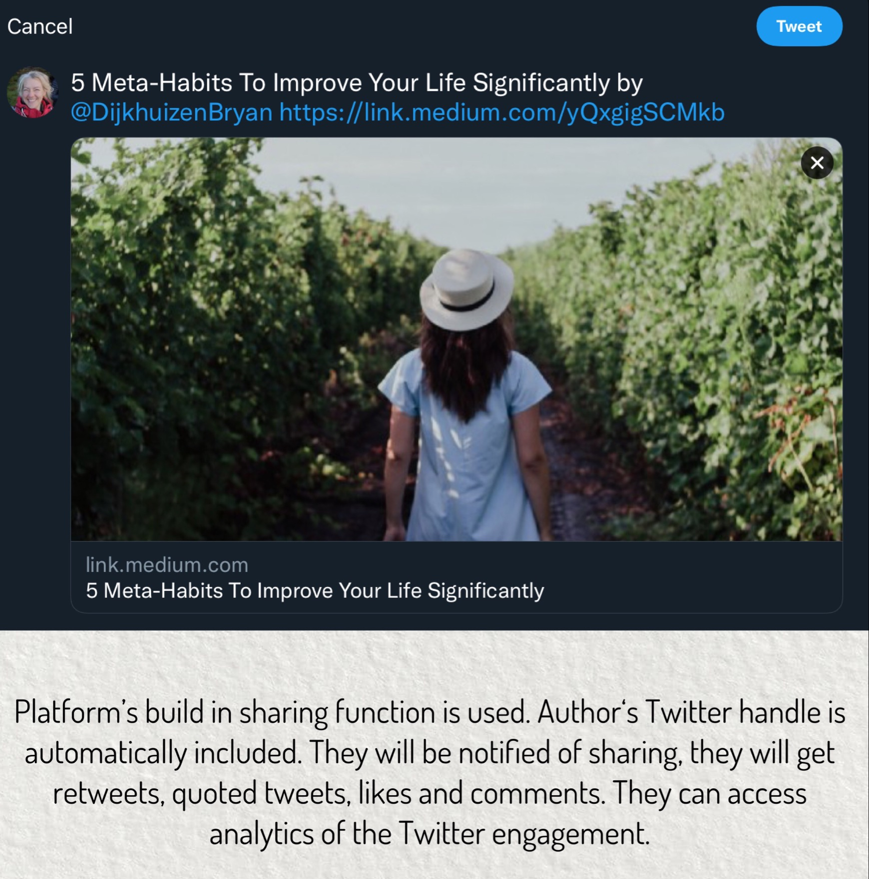 What happens if the author has a private Twitter account or is not on Twitter? In this case tagging is not possible. But then, because author does not utilise this form of impact tracking, we think it should be okay to share material as long as due diligence is shown with respect to attributing ownership. What do you think?