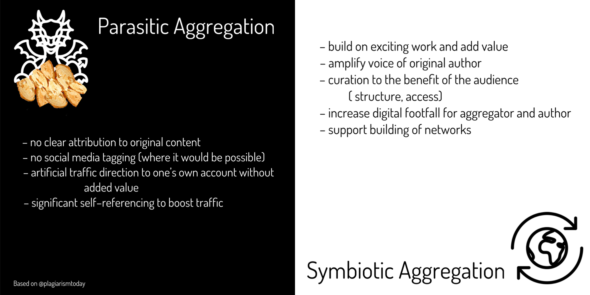 Jonathan Bailey, states that “If you use or link to other content, you are probably an aggregator, at least in some capacity” (Bailey, 2010) and then follows with ‘we are all aggregators’ (Bailey, 2015).  But there are different approaches to aggregation and, depending on how transparent the attribution is, these can be classified either as parasitic or symbiotic. We believe that transparency (Silverman, 2014) and how attribution is carried out seem to underpin these critical differences.