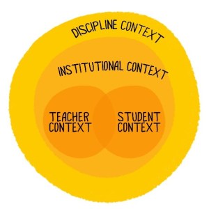 Fourth, closely linked to this is the disciplinary context. What habits of heart, mind and hand do students need to develop to become proficient in my field? What are the big ideas and thresholds in my discipline? How have they changed in the past 50/20/10/5 years?