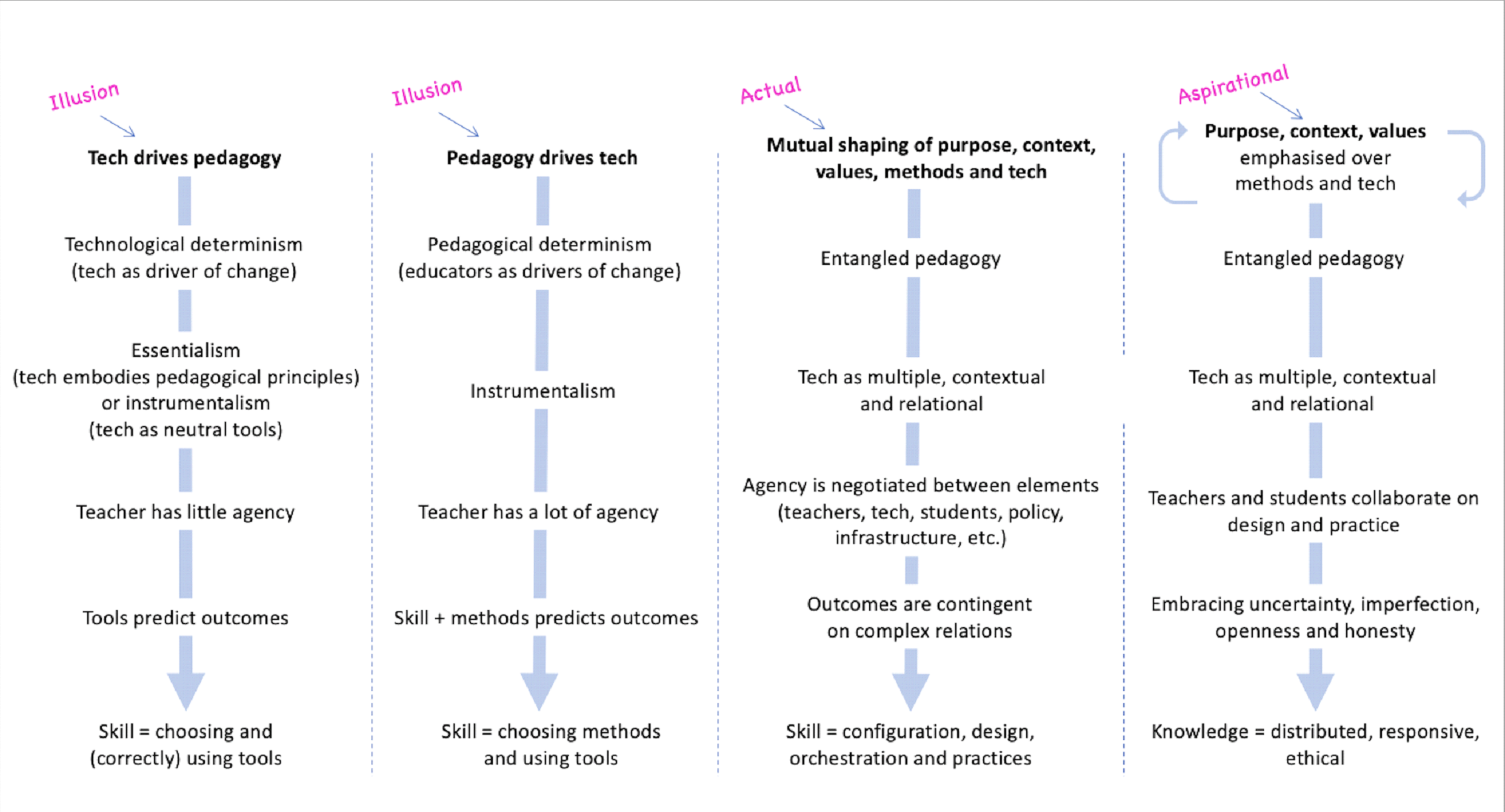 Trying to put technology or pedagogy first is also indicative of technological or pedagogical determinism (the idea that either technologies or educators drive social change independently of other contributing factors). From an entangled view, outcomes and agency are negotiated between various stakeholders and elements. I suggest that, rather than thinking of a technology / pedagogy dichotomy (or of technology or pedagogy as driving education), we think of a mutual shaping of methods, technologies, purposes, values, and contexts. This gives more clarity around what to keep in mind as we iteratively attend to different aspects of design. The last column in the diagram above shows an aspirational view of how educational stakeholders can work together (through openness, honesty and an acceptance of uncertainty and imperfection) to generate distributed, responsive and ethical educational knowledge. I hope that this gives us a basis for an interesting and helpful chat about how these ideas might apply across a range of different educational setting. You may wish to try this activity before joining the chat on Wednesday evening: