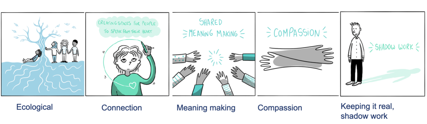 Flourishing spaces are characterized by curiosity, creativity, compassion, and co-creation. They invite participants to engage with their humanity, challenge existing hierarchies, and imagine new possibilities for growth and connection. In order to support the creation of flourishing spaces and oases in our workplaces, we have created a Flourishing Spaces ‘ASK’ toolkit:
