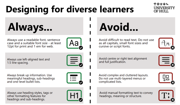 When we talk about design in teaching and learning, it’s easy to think of it as something ‘extra’—perhaps the fonts and colours we choose or the images and diagrams we add. But in reality, these design decisions form a vital part of how we communicate with our students – inside and outside the classroom or lecture theatre. Inclusive learning design is so important because, in today’s diverse and dynamic HE environment, students arrive with a vast range of prior experiences, cultural backgrounds, and individual learning needs. These learning needs could include alt text for those with an visual impairment, an ability to use text-to-speech for those with dyslexia or the ability to navigate an app without the use of hands (or limbs). Where not met, such needs would lead to a reasonable adjustment request, but we can do better and should preemptively meet such needs wherever possible. For this, we must ask ourselves: Who does our design invite to participate, and who does it leave behind? The real problem is that this isn’t easy. The average professional working in HE isn’t a trained designer. While frameworks like Universal Design for Learning and Web Content Accessibility Guidelines (WCAG) exist, they are complicated – and can be difficult for practitioners to interpret. In recognising these challenges, we designed a HE-focused set of design guidance that could fit on a single sheet: Designing for Diverse Learners. You can read the background to our project online, or check out the guidance here: Designing for Diverse Learners (D4DL). While we would not claim to have addressed every issue, we have produced a clear set of principles that are a solid starting point.
