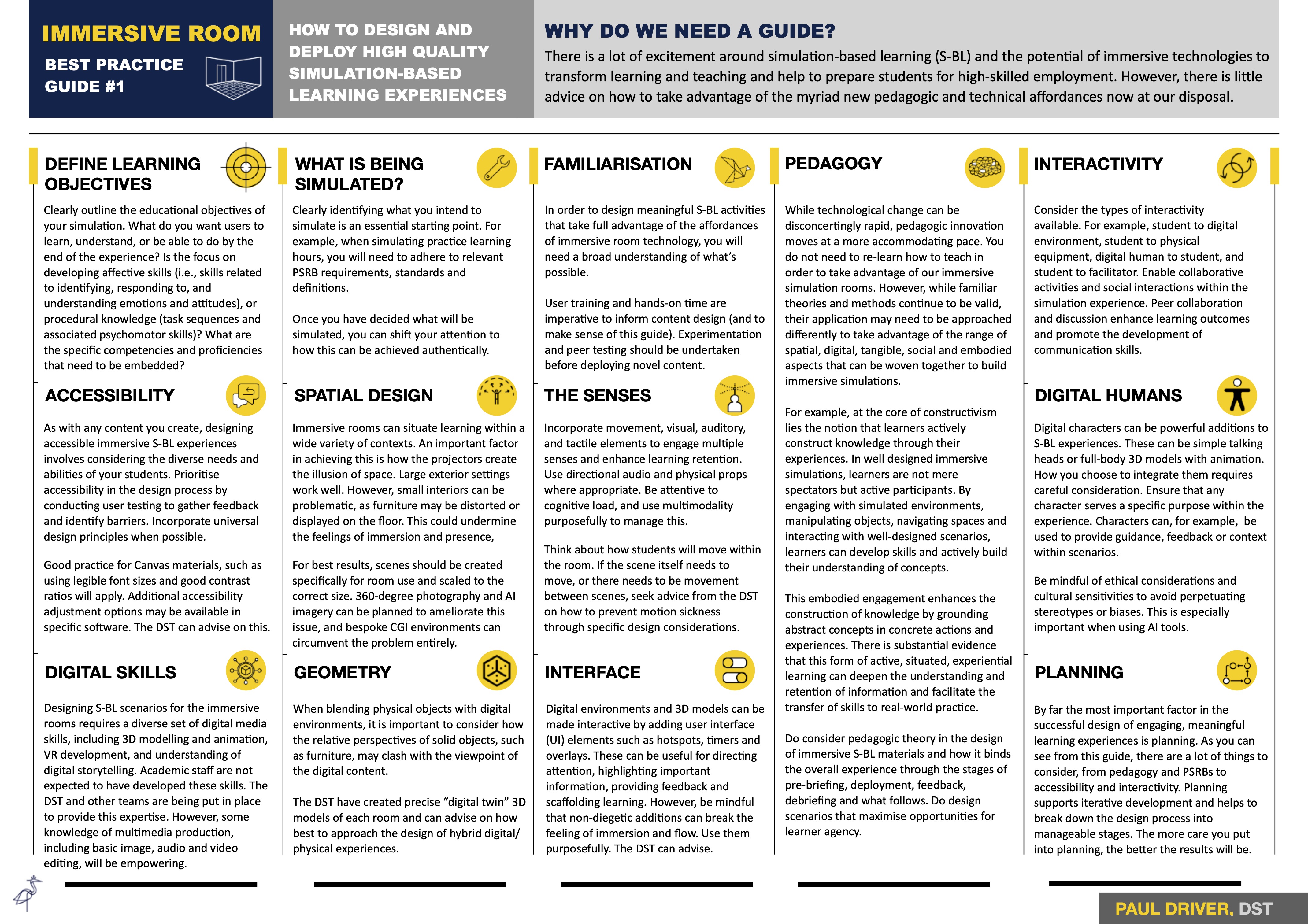 Immersion doesn’t happen by accident. It requires intentional design, interdisciplinary collaboration, and a grounding in pedagogic theory. As an illustration, in my Immersive Room Best Practice Guide (see image below) I outline 13 areas educators must consider, including cognitive load, multimodality, Interface design, accessibility and, of course, pedagogy. I created this as a quick-starter guide-on-a-page, so it is far from comprehensive.